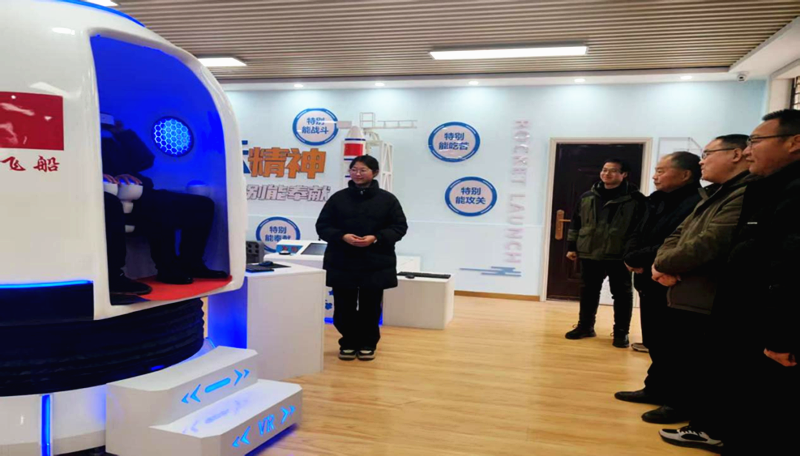 走进王店中学卓越农村中学科技馆,“载人航天精神”主题展区率先映入眼帘。高耸矗立的火箭模型极具视觉冲击力,“特别能吃苦、特别能战斗、特别能攻关、特别能奉献”的醒目标语,瞬间点燃了在场人员对宇宙探索的无限向往,让航天精神的传承氛围扑面而来。在“神舟飞船”VR体验舱前,班子成员亲自佩戴设备,沉浸式体验太空遨游之旅,在虚实交织的场景中直观感受我国航天事业的磅礴发展力量,深切体会到科技科普与前沿科技融合的独特魅力。