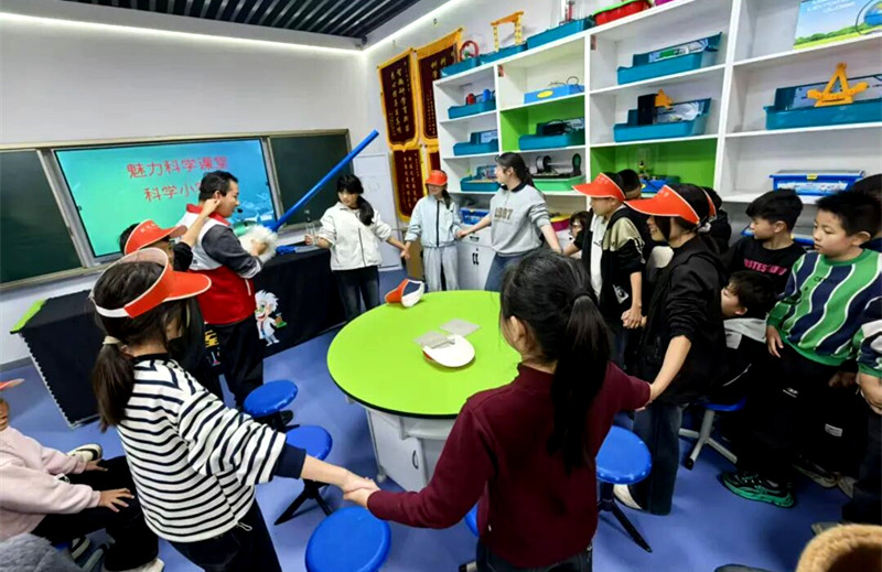 魅力科学课堂,通过“莱顿瓶”、“怒发冲冠”、“徒手电灯”三个小实验,向同学们揭秘了摩擦起电、人体导电的电学原理。“莱顿瓶”实验,科技辅导员操作莱顿瓶积累电荷,让体验者感受轻微电击感。“怒发冲冠”实验,体验者站在绝缘台上,双手触碰静电球,科技辅导员摩擦静电棒,体验者头发从柔顺状态变得蓬松直立,一根根发丝向外舒展,竖起,宛如“小刺猬”般可爱。“徒手电灯”实验,体验者在科技辅导员的指导下,将双手分别触碰特质灯泡的金属触点,原本熄灭的灯泡瞬间亮起。