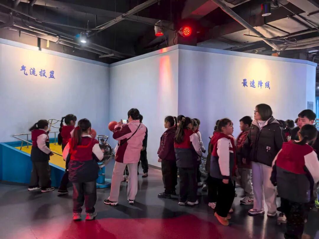 活动现场,同学们在科技辅导员的带领下参观了前沿科技、科技文明、儿童乐园、航空航天等展区。前沿科技展区,“东风导弹”、“中国核武”、“奋斗者号”等国之重器模型依次陈列,大家驻足凝视,认真聆听辅导员讲解大国重器背后的研发故事与硬核科技,从导弹的精准制导原理,到核武的战略意义,再到“奋斗者号”深潜万米深海的突破,每一段介绍都让同学们热血沸腾,深深为祖国的科技实力感到自豪。科技文明展区,最速降线展项上三个篮球从不同坡度的轨道上降落,大家同时发问:“是不是直线轨道上的小球跑得最快?”然而,看似“绕远路”的篮球却最先抵达终点。科技辅导员用通俗易懂的语言讲解了最速降线的物理原理,将抽象的科学知识融入趣味实验,让孩子们在互动体验中,读懂藏在现象背后的科学密码。