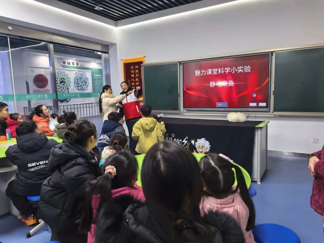 “人体导电”实验,科技辅导员让孩子们手拉手连成闭合电路,首尾两端的孩子握紧实验装置的金属触点时,科技辅导员按下开关,孩子们感受到轻微的电击感,科技辅导员向孩子们讲解原理:人体含有大量水分和电解质离子,这些离子能形成电流,使人体成为导体,同时提醒大家湿手不碰插座等安全常识。“静电章鱼”实验将现场氛围推向高潮,科技辅导员通过摩擦塑料棒使其带电,当带电塑料棒靠近塑料丝制作的“章鱼”时,塑料丝触手因同种电荷相互排斥而张开,仿佛灵动的章鱼在“游动”。科技辅导员结合脱毛衣起静电等生活现象详细讲解了摩擦起电的科学原理,让抽象的电荷概念变得可感可知。