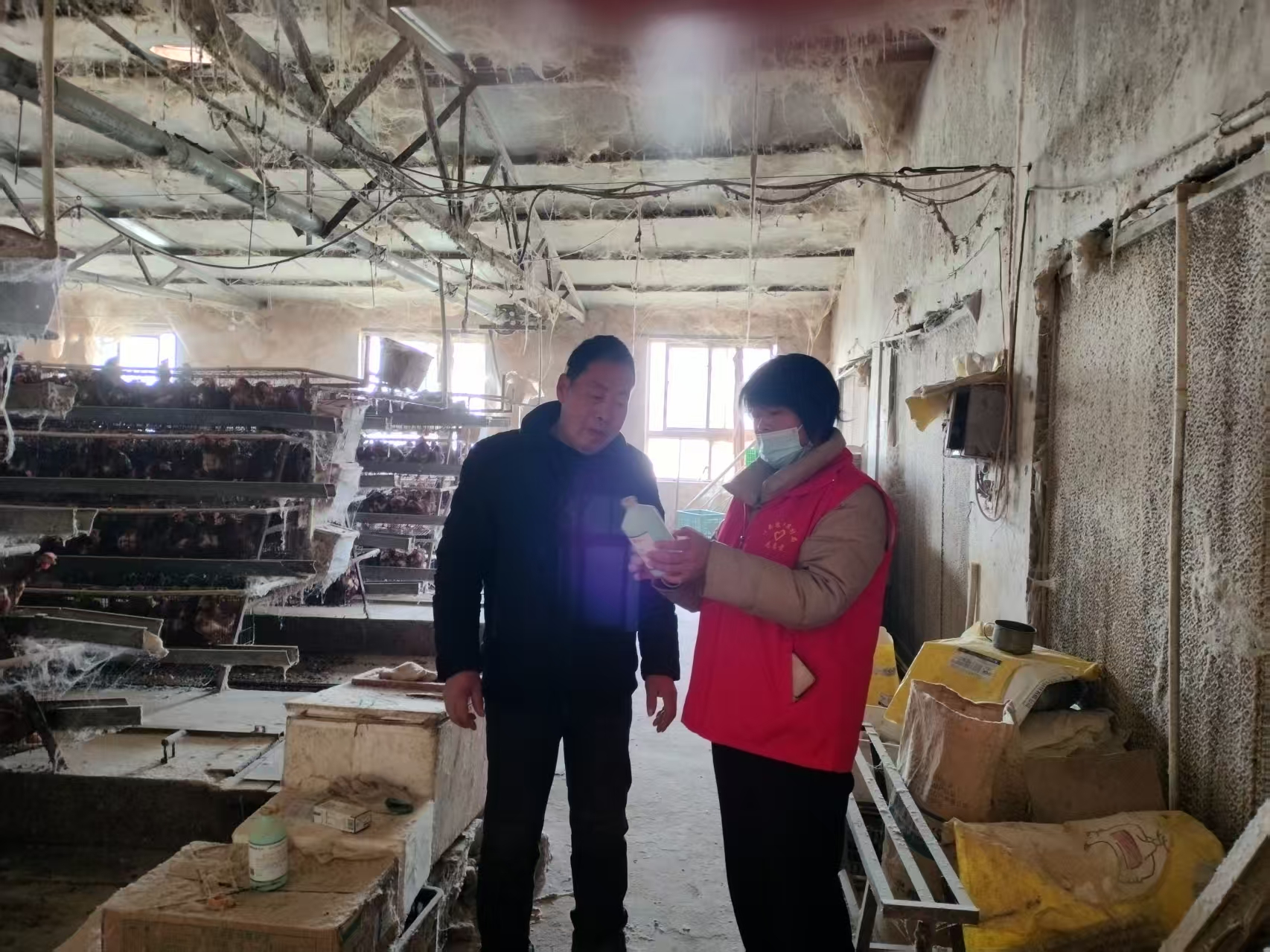 进入养鸡场,两位特派员认真检查鸡舍内鸡群状态、供暖设施运行并询问近期防疫情况。针对下雪降温带来的鸡舍承压、低温应激等问题,现场指导养殖户在鸡舍门口加装防风帘、悬挂保温灯,并预留换气缝平衡保温与通风,避免高湿低温诱发呼吸道疾病。“雪后要及时清理鸡舍房顶和周边积雪,最好用温井水饮水,每天至少换水两次防结冰断水”,王丽锋一边示范一边叮嘱。同时,她还建议将鸡饲料中玉米的占比提升至60%以上,添加多维电解质增强鸡群抗应激能力。