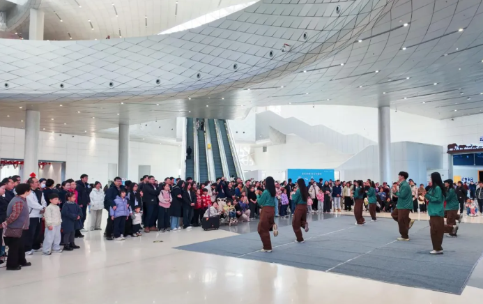 一层中庭年味浓浓。宇树机器人化身新春使者翩然起舞,尽显科技之美;“科科公主”巡游与观众亲切互动、问答送福,展厅内欢声笑语不断;《金色时光》舞蹈快闪活力上演,科技辅导员的灵动演绎,让传统年味与现代科技同频共振,勾勒出一幅生动鲜活的“科技中国年”画卷。