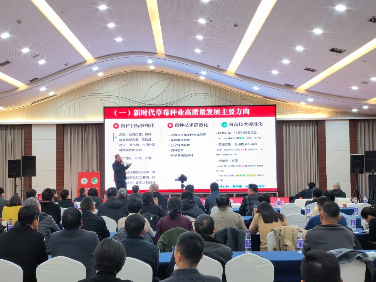 亮点纷呈,互动性强与往届相比,本届大会亮点纷呈、互动性更强。最引人注目的莫过于“新品种精品草莓展示与品鉴会”,全省上百份草莓样品同台竞技,由专家从外观、果形、色泽到风味进行全方位品鉴,展现出河南草莓育种的丰硕成果与卓越品质。不仅如此,大会还创新设立了参会人员现场网络投票环节,由大家选出“十大最佳创新品种”与“十大最具发展潜力品种”,让品种评价更接“地气”、更贴近市场。与此同时,大会通过全程线上直播、设置“云端问答”,打破了时空限制,让更多未能到场的从业者共享这场知识盛宴。