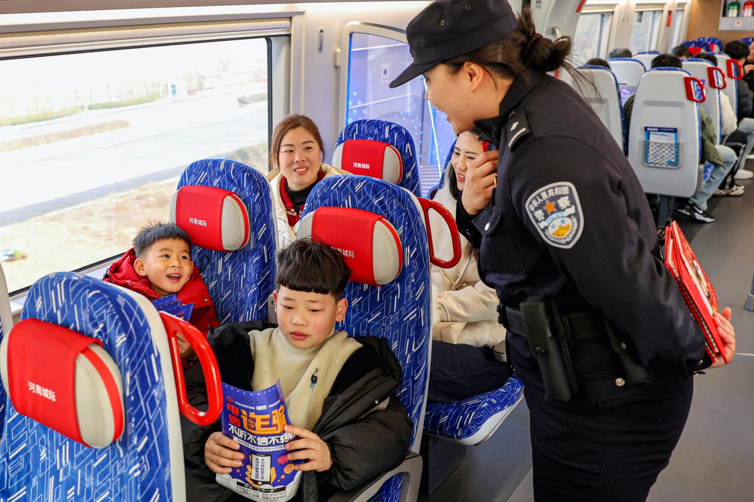 郑州乘警支队民警在列车上开展了反诈宣传,通过发放手册、现场讲解等方式,提醒旅客加强防范意识、核实转账信息,切实守护财产安全。民警还与小朋友互动,普及识别电信诈骗的常识,助力提升旅途安全意识。