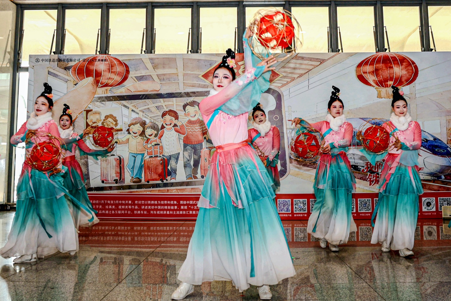 在开封站,一场融合中原特色的文艺展演同步举行。身着汉服的舞者手持红灯笼翩然起舞,将大宋古风的典雅与春节喜庆相结合,吸引不少旅客驻足欣赏。