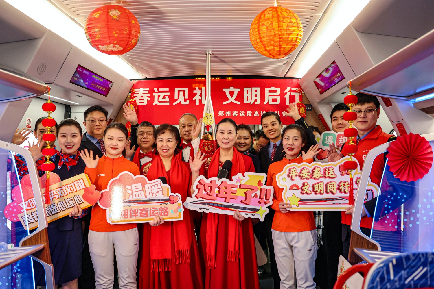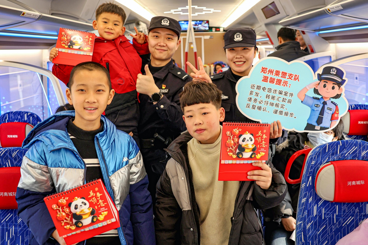 在开往开封的城际列车上,车厢以灯笼、中国结、葫芦雕刻等元素装饰,洋溢着喜庆的节日气氛。列车工作人员与老年文艺志愿者共同开展“春运见礼”互动活动,手持“温暖相伴春运路”“平安春运 文明同行”等主题手牌,向旅客表达新春祝福。郑州客运段高铁一队乘务员还向儿童旅客赠送印有熊猫图案的新年台历,传递节日问候。